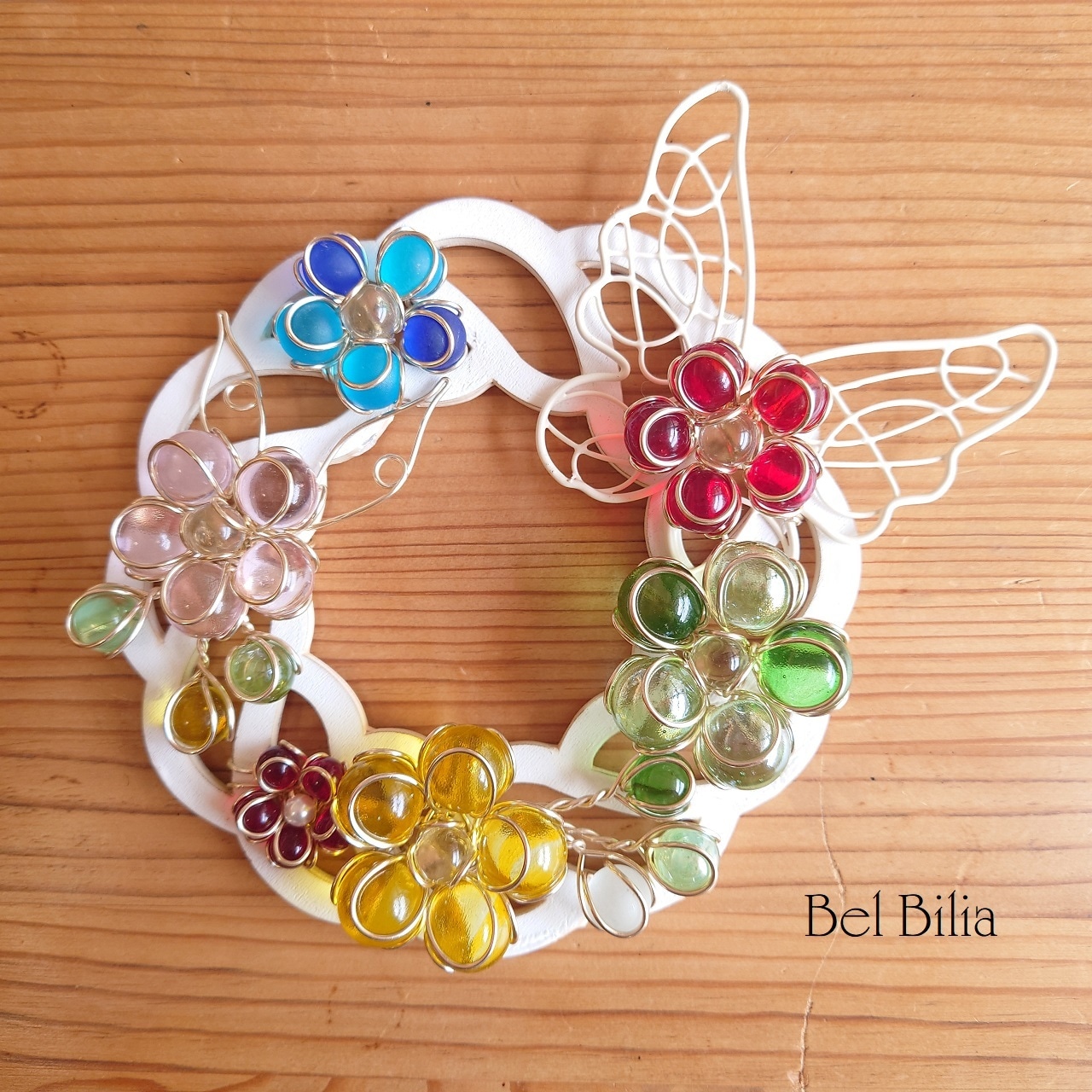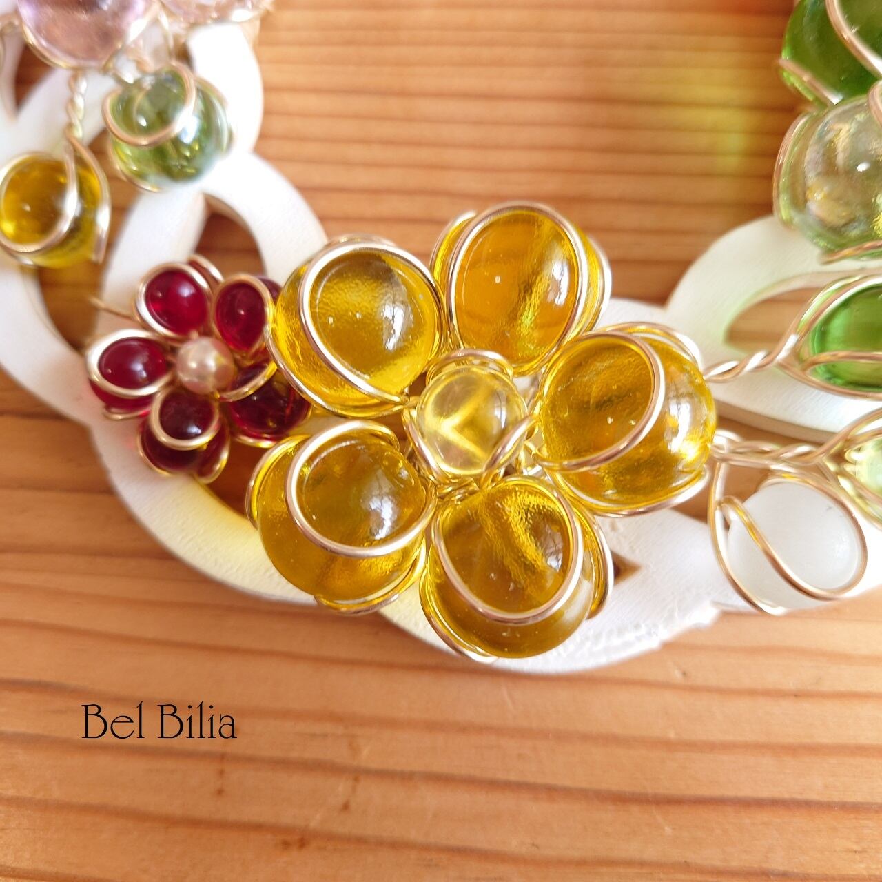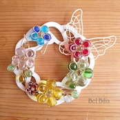 透明なガラスのビー玉の花が、光にあたると煌めいて可愛らしいリース。
