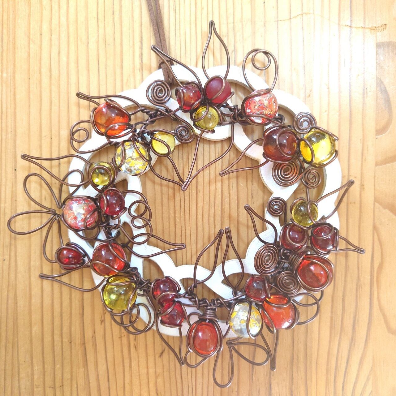 ビー玉をアルミワイヤーで編んで製作したマーブルアートのリースです。