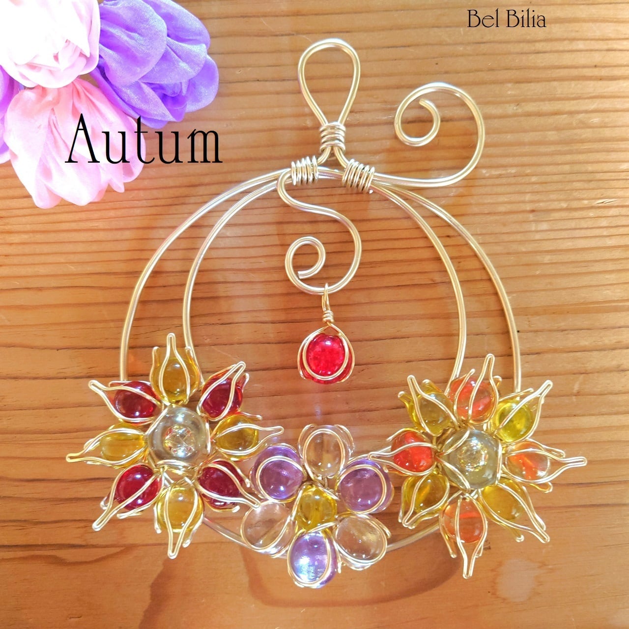 紅葉をイメージしたチャームとビー玉の花も、まるで紅葉のよう。