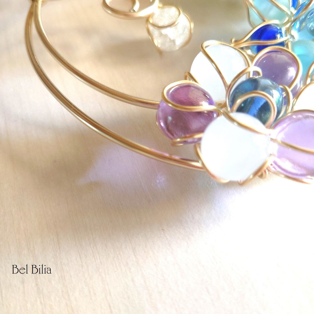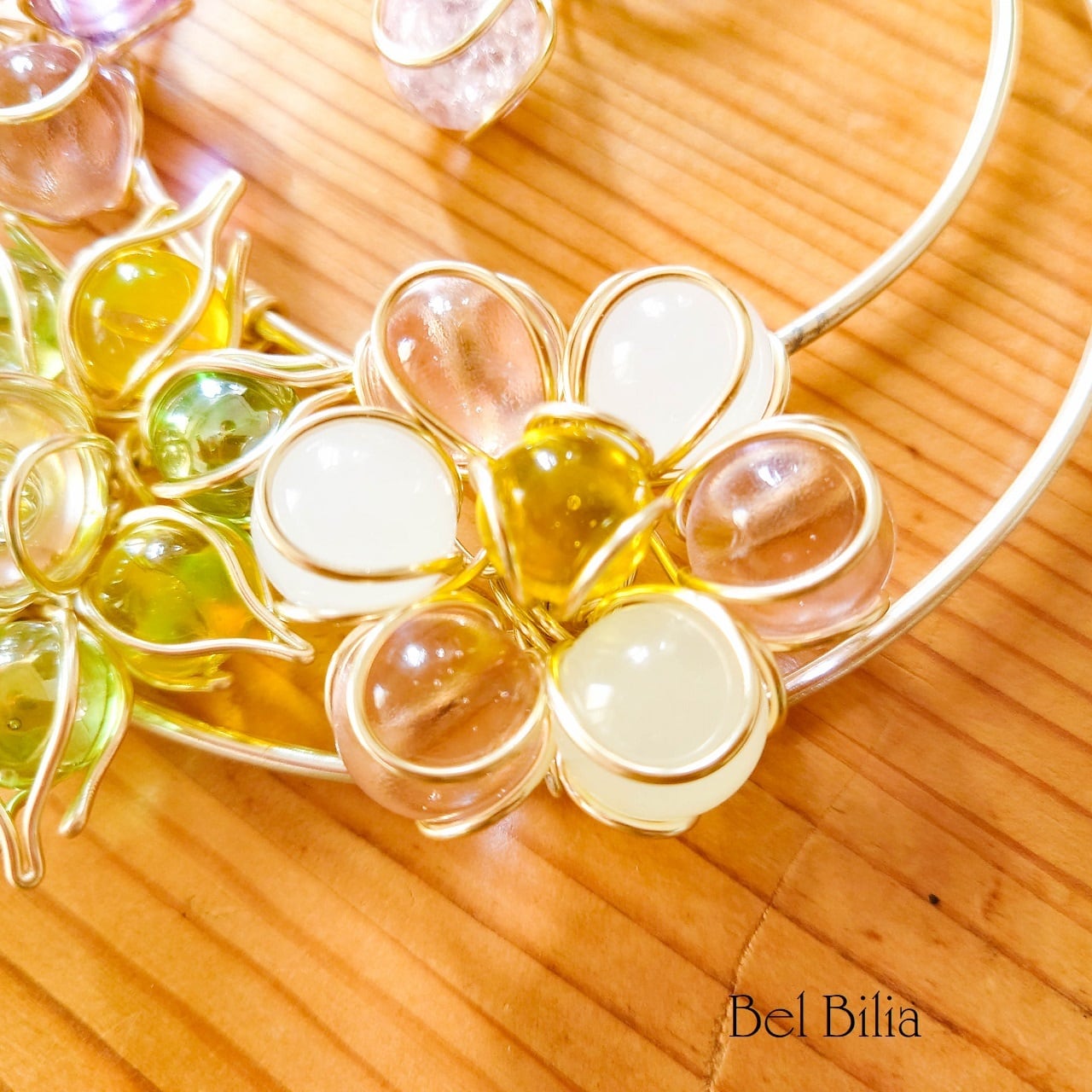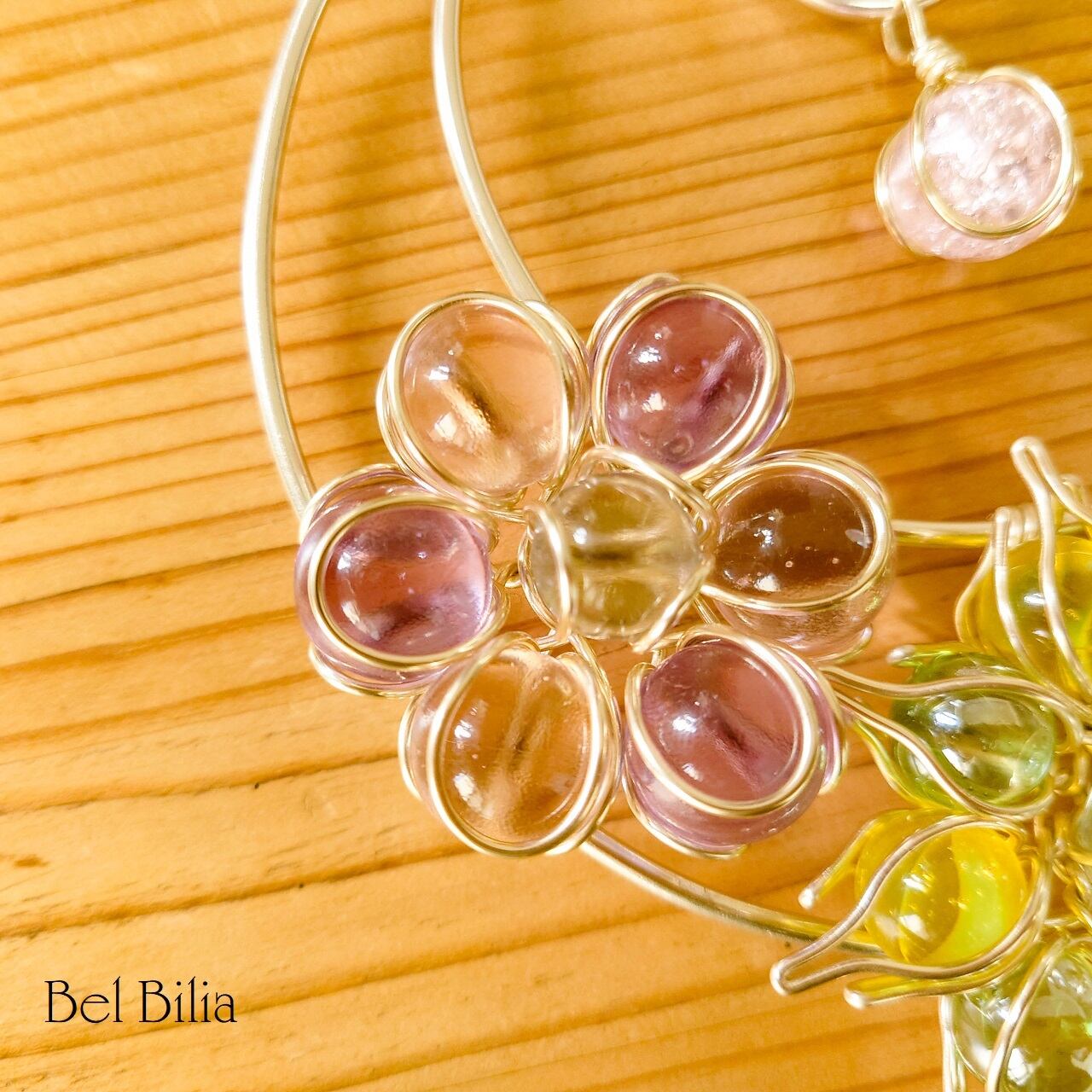 春の柔らかさとあたたかさをイメージした、淡いピンクと紫のビー玉の花に、新緑の緑や優しい日差しをイメージしました。