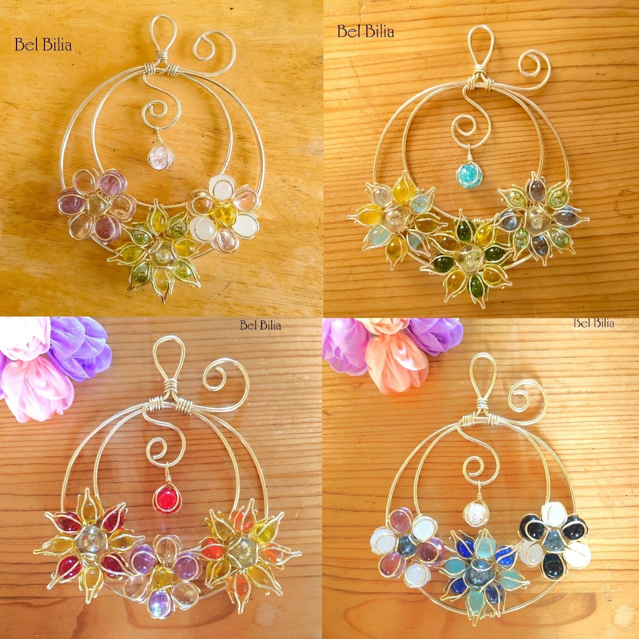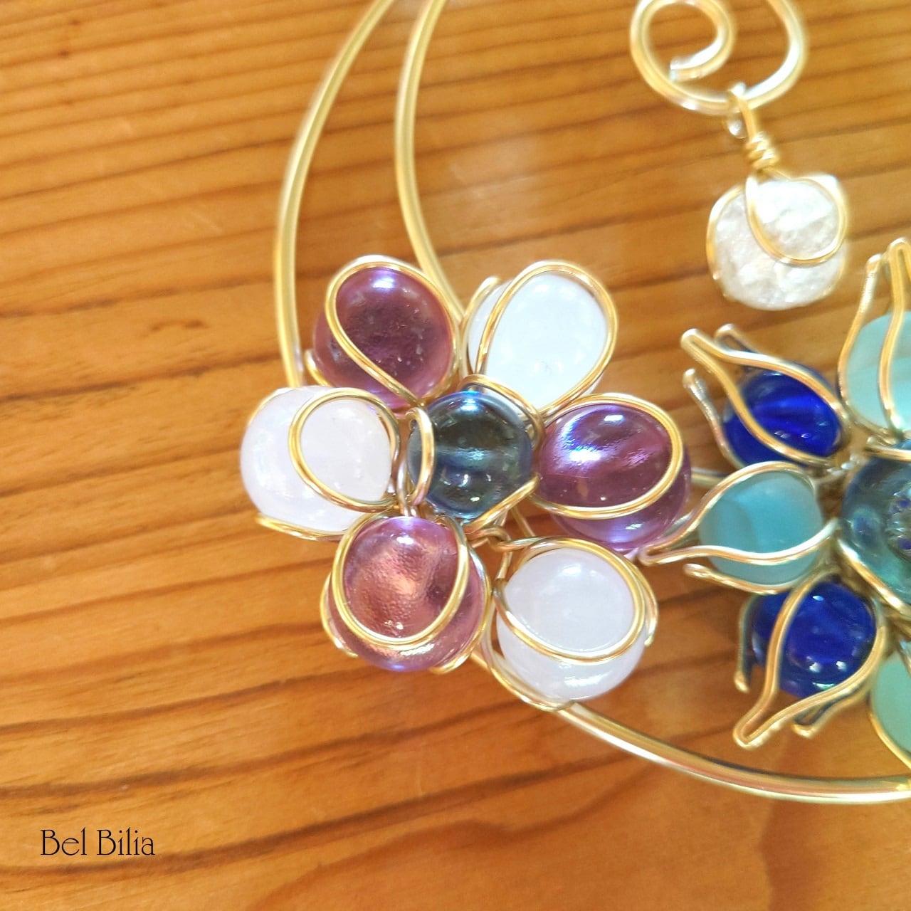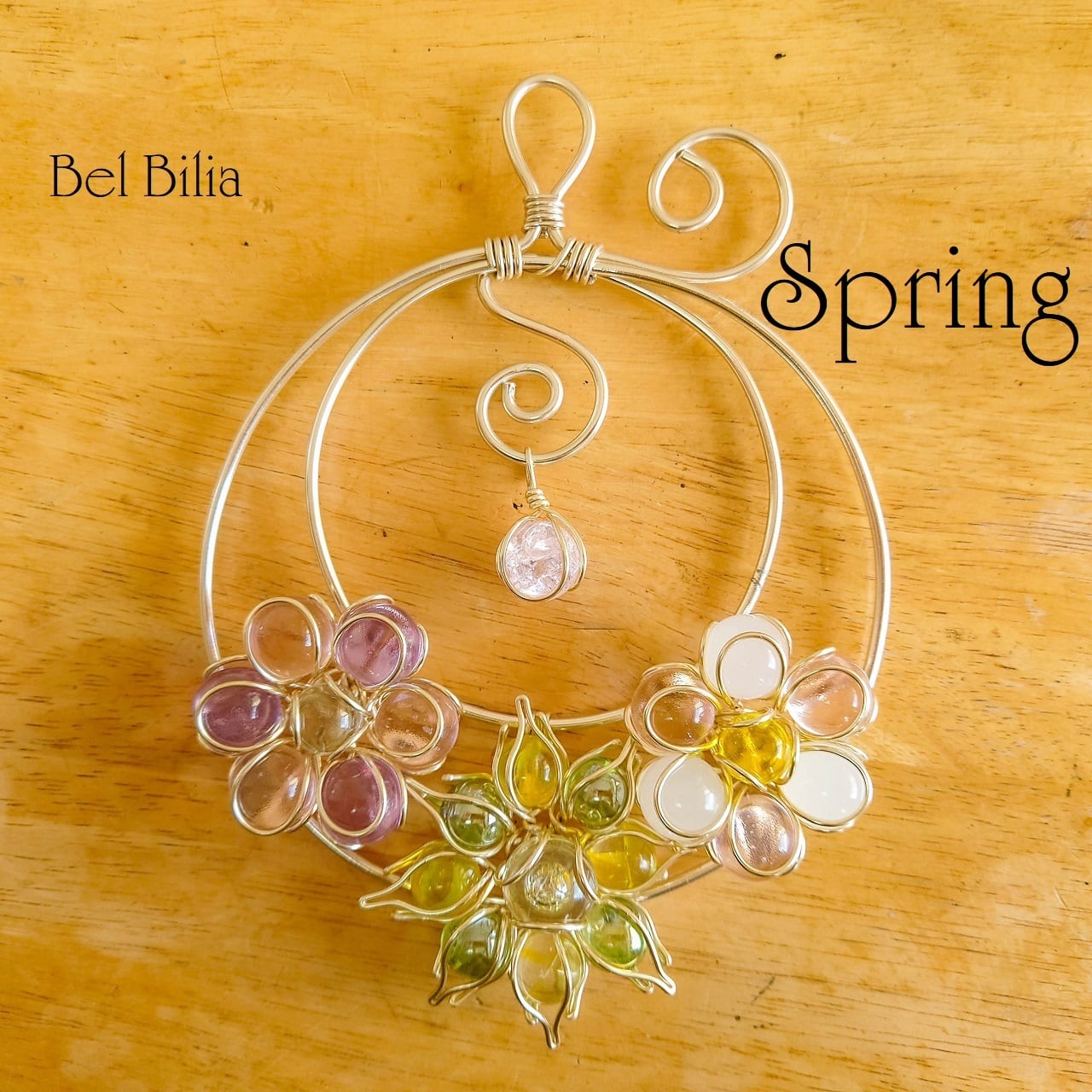 春の柔らかさとあたたかさをイメージした、淡いピンクと紫のビー玉の花に、新緑の緑や優しい日差しをイメージしました。