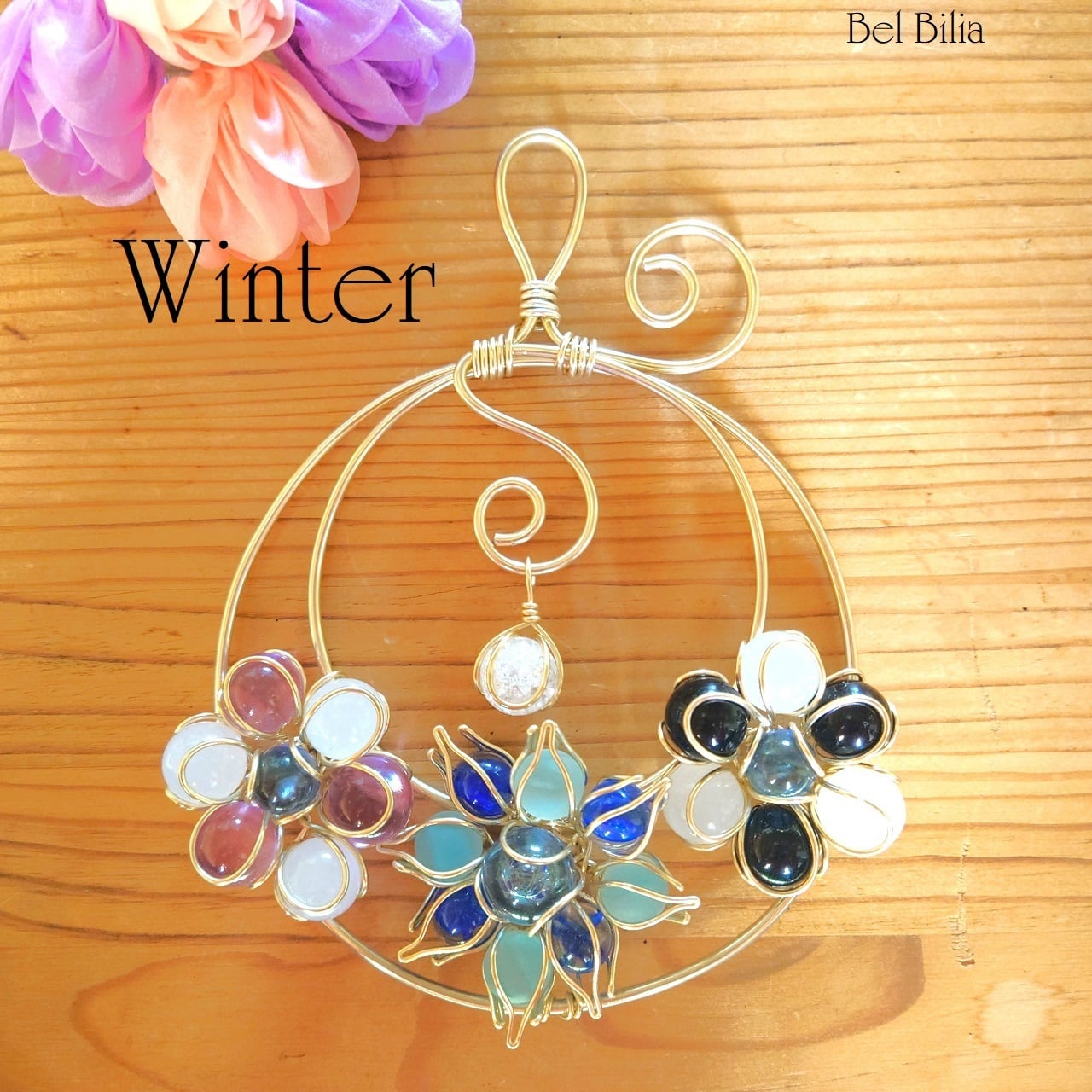 チャームも白く、雪のような白いビー玉を配置。