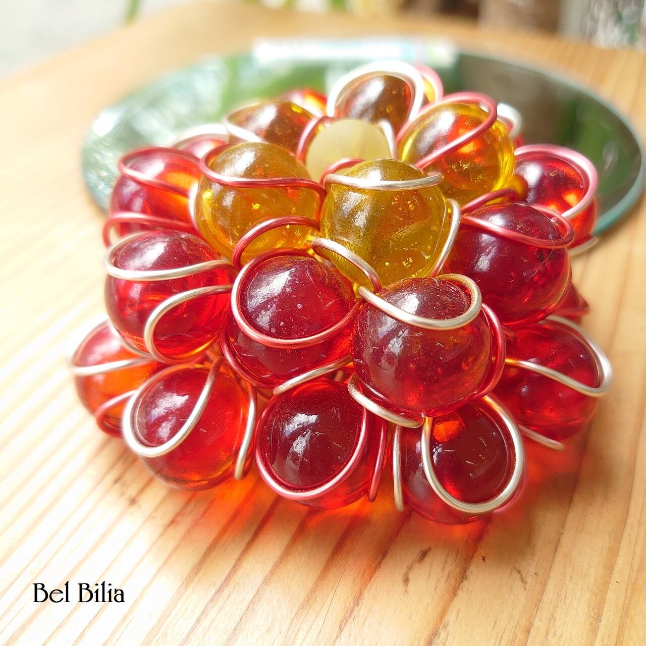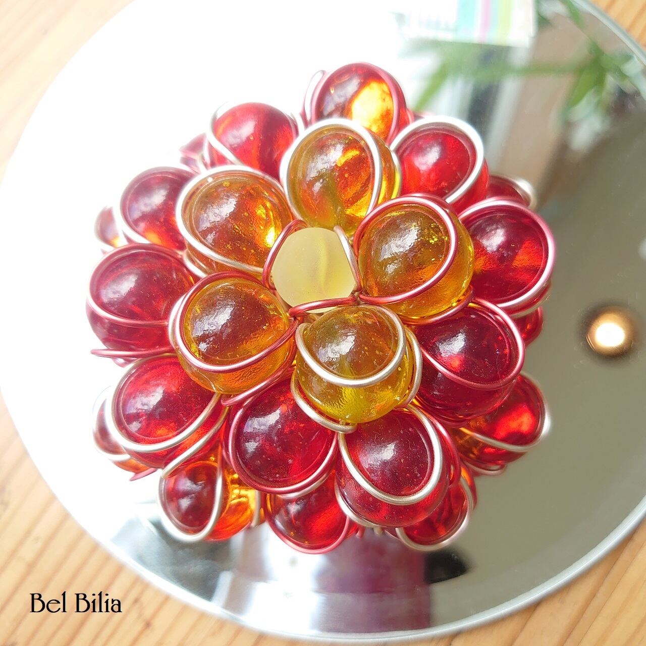透明なガラスの花びらが丸くて優しい色彩を放つ置物。