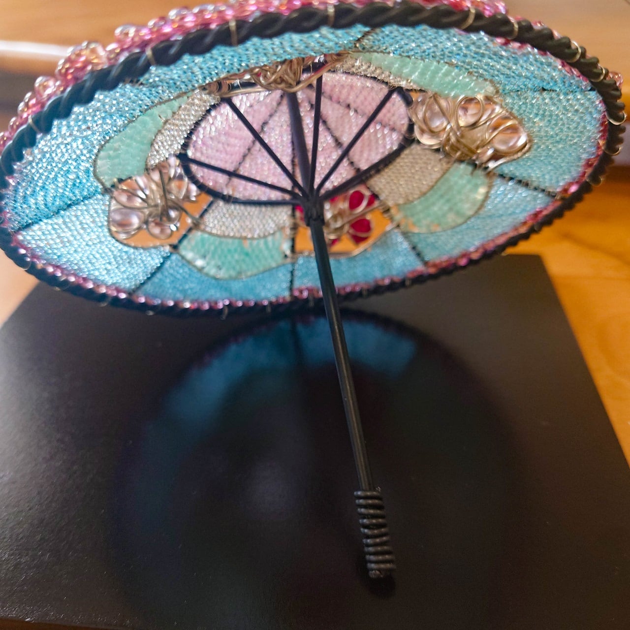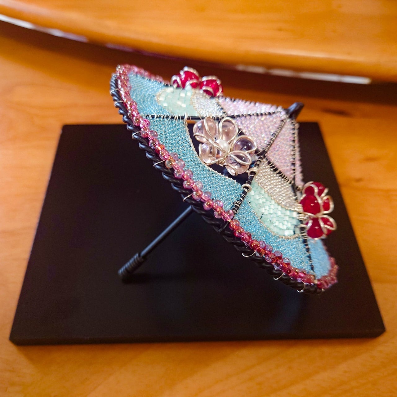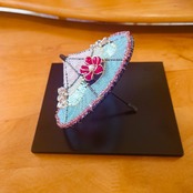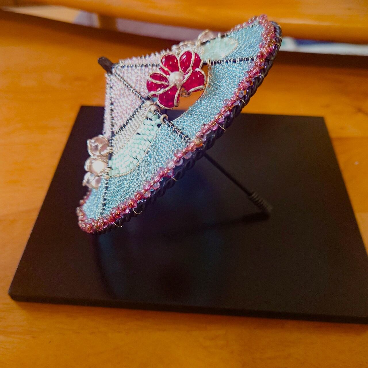 ビー玉をあしらい、ビーズで編み込んだミニチュアの舞傘の置物。