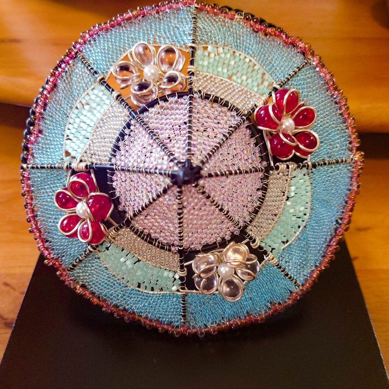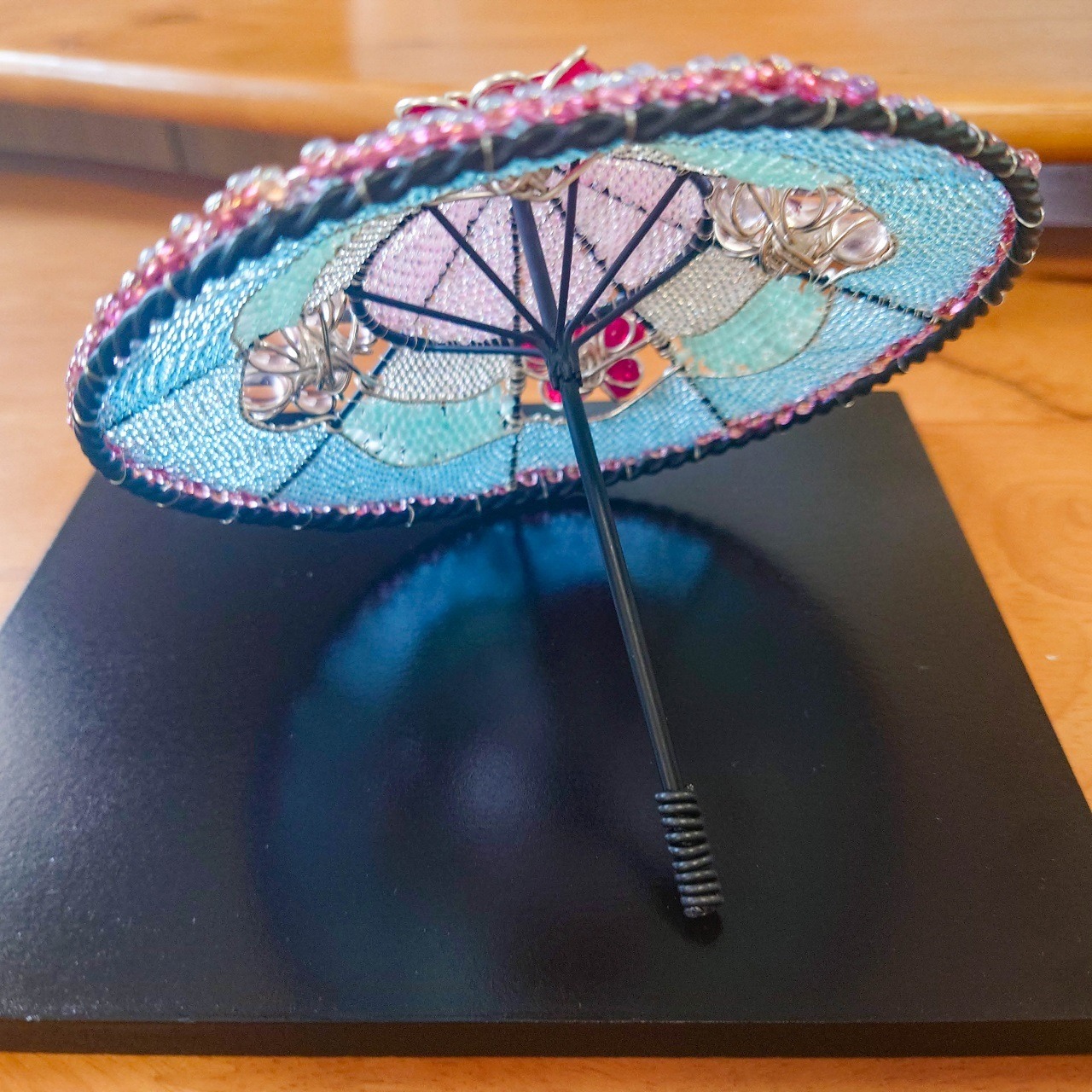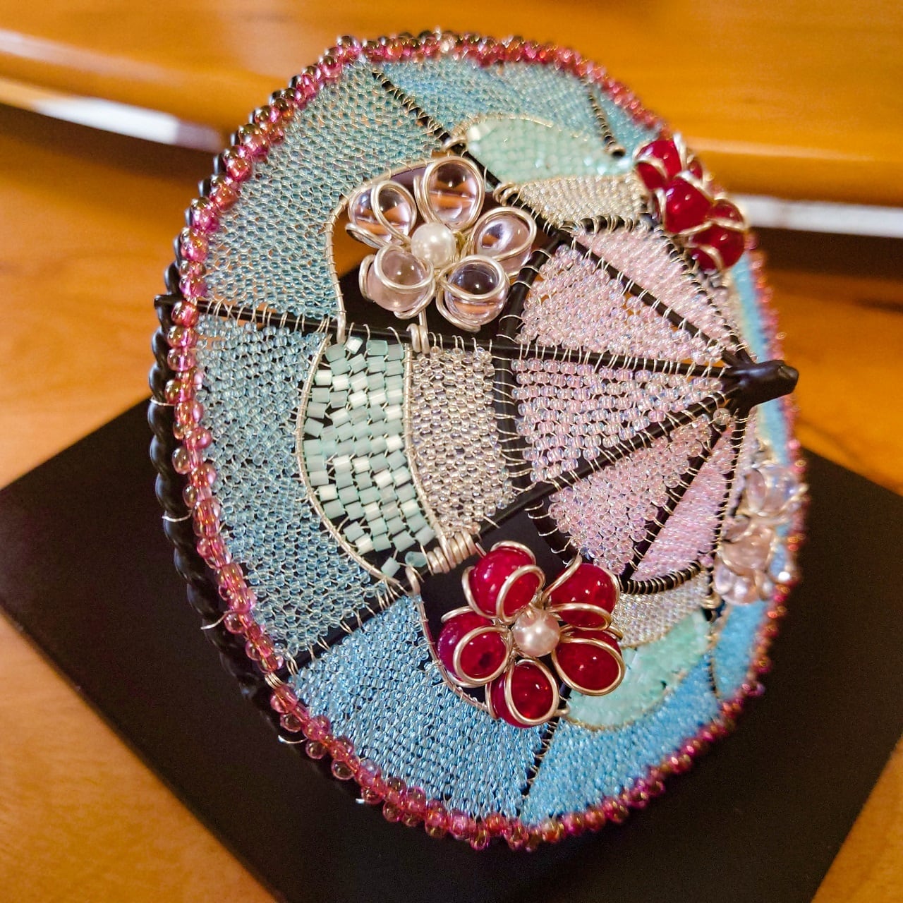 ビー玉をあしらい、ビーズで編み込んだミニチュアの舞傘の置物。