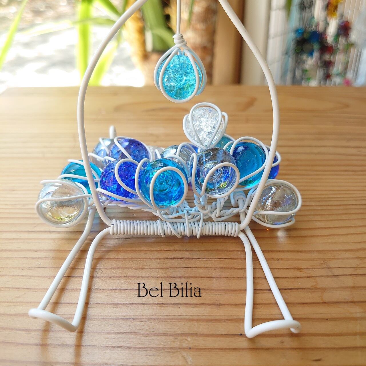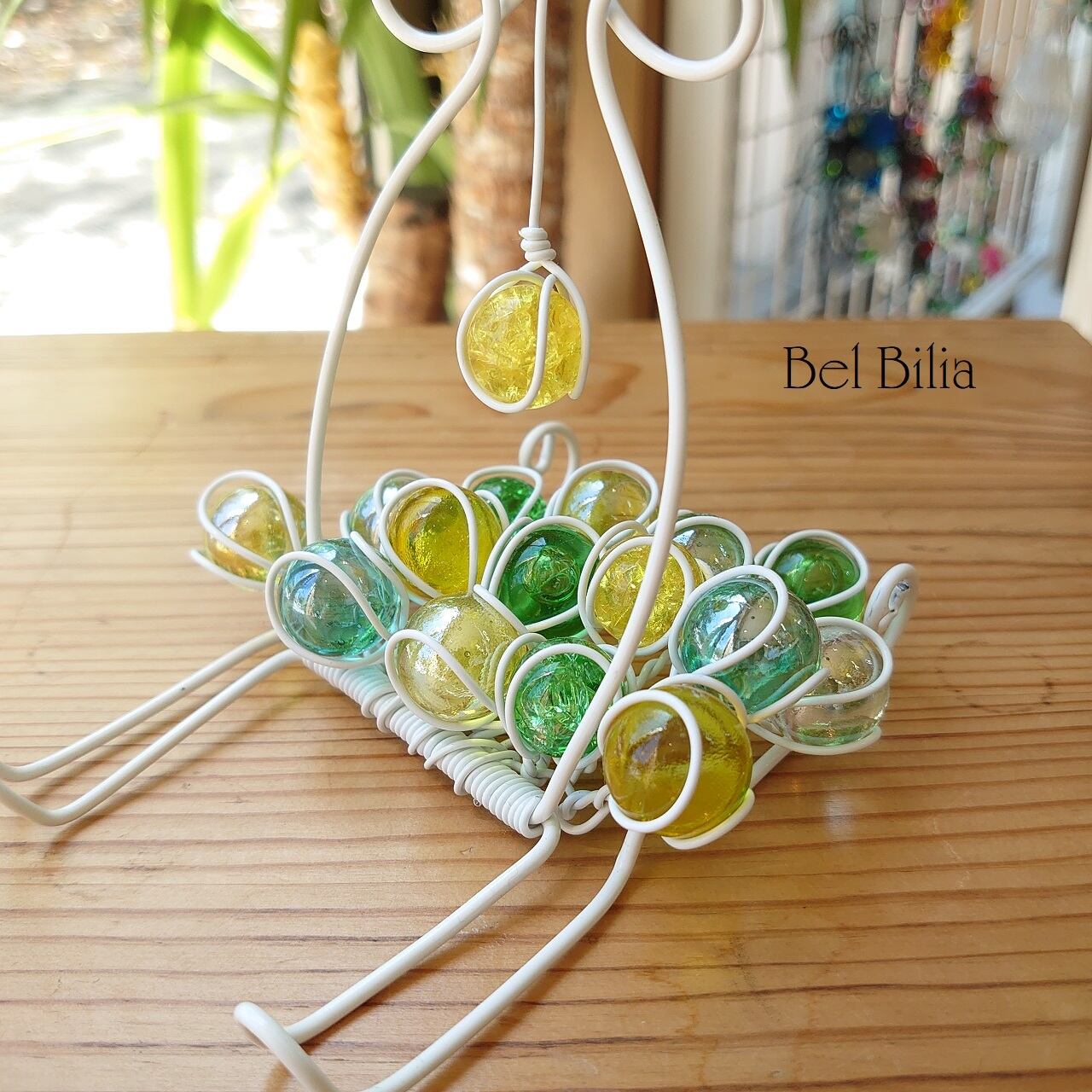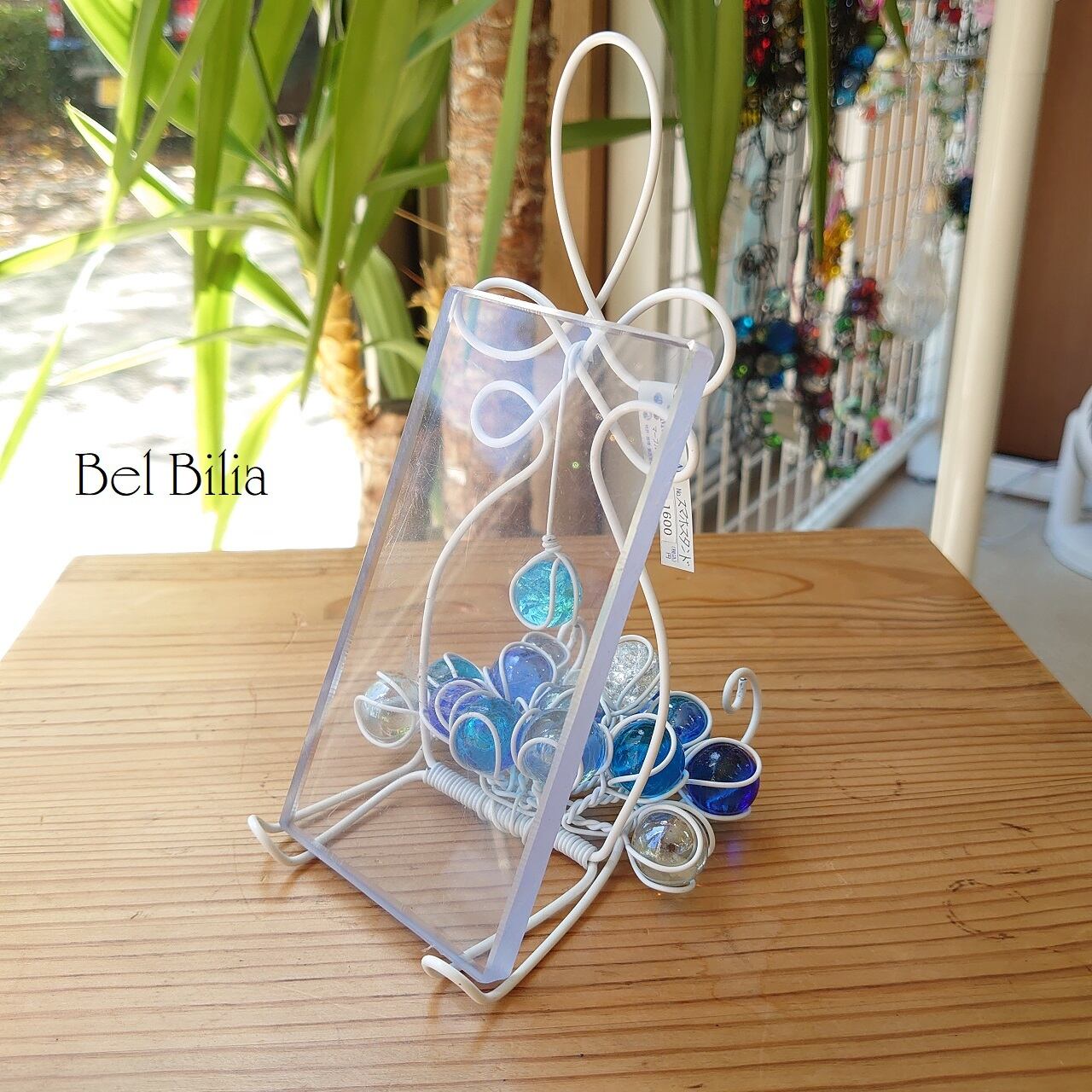 ビー玉とワイヤーで作られた、マーブルアートのスマホスタンド。