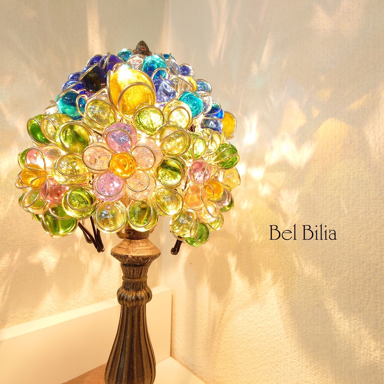 ビー玉とワイヤーで作られた、マーブルアートのランプ。