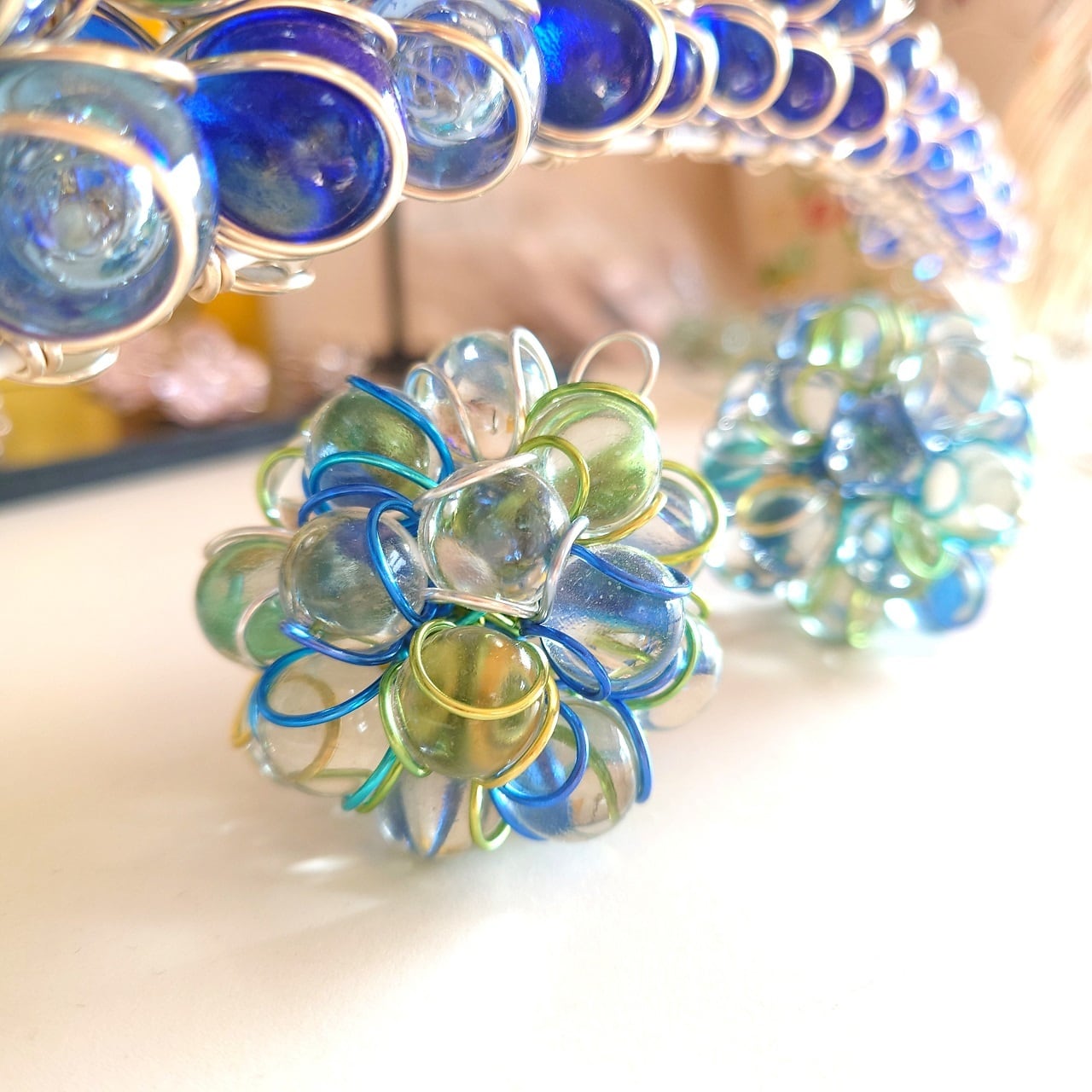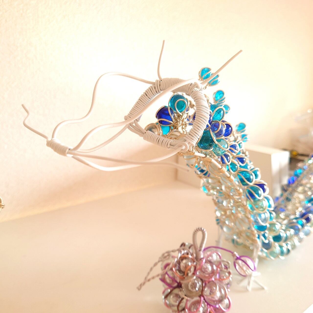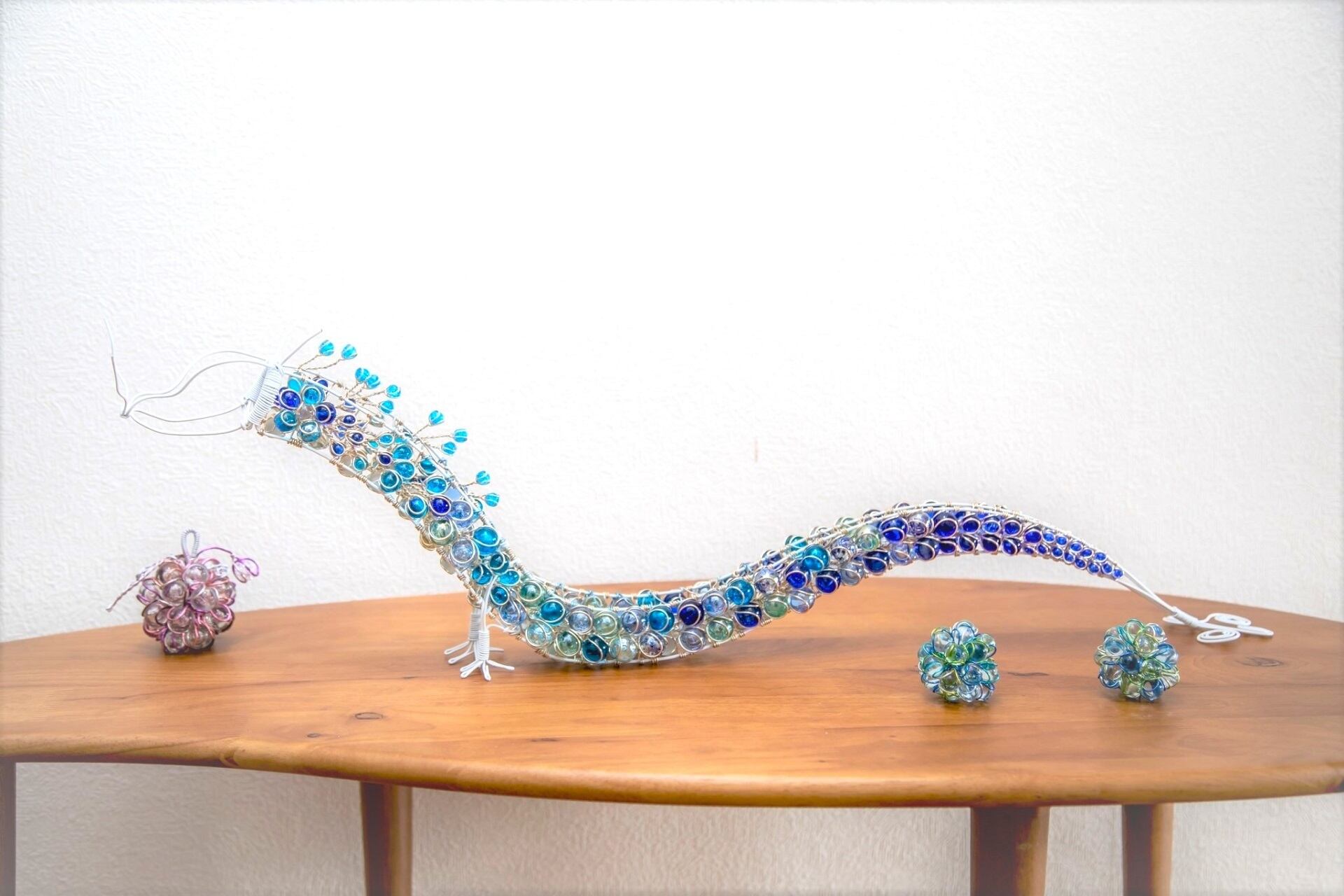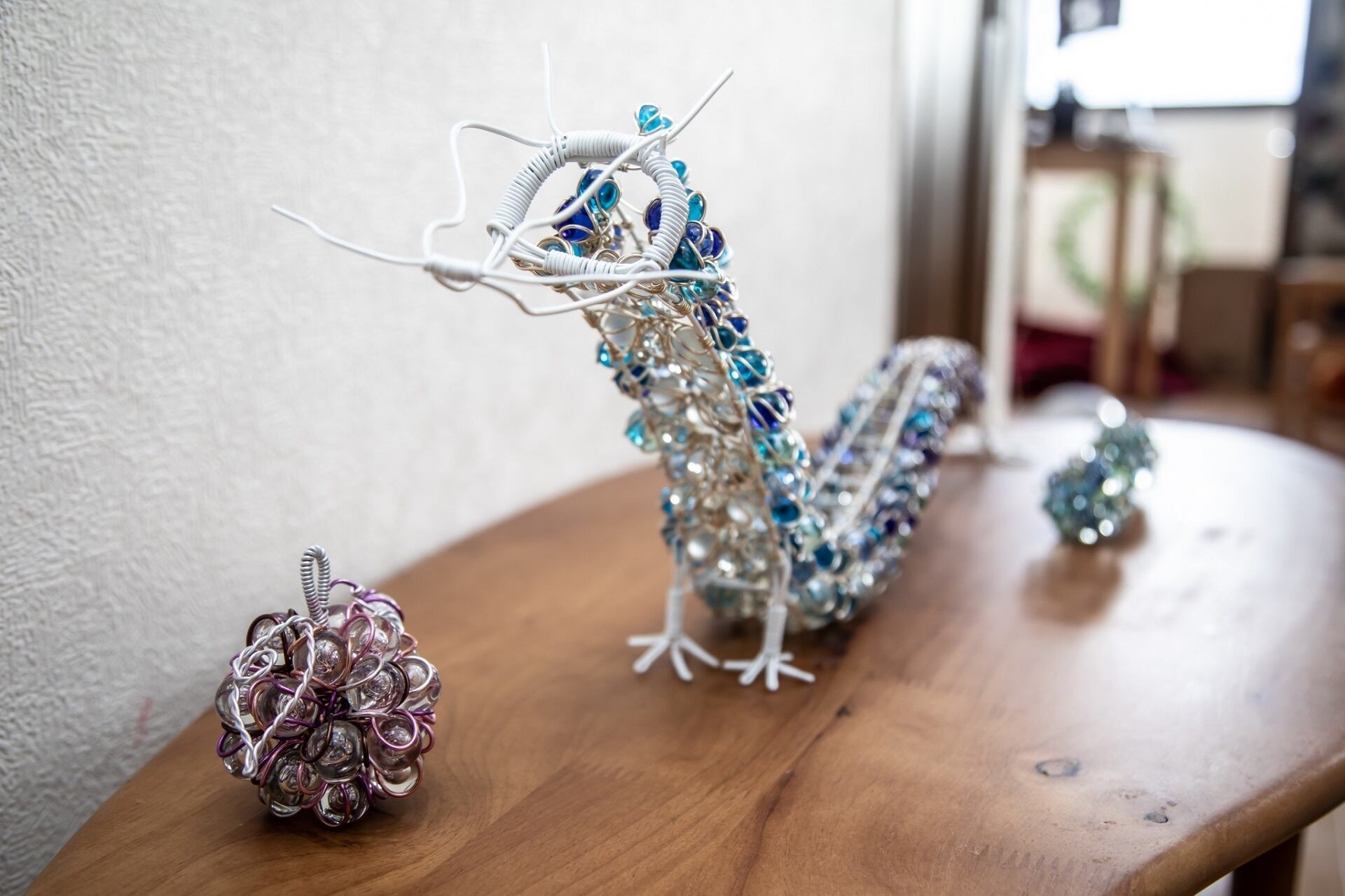 セットで付いてくるピンクのワイヤーの玉と、ブルーグリーンの玉二つは、龍の周りにお好きな配置でお飾りください。