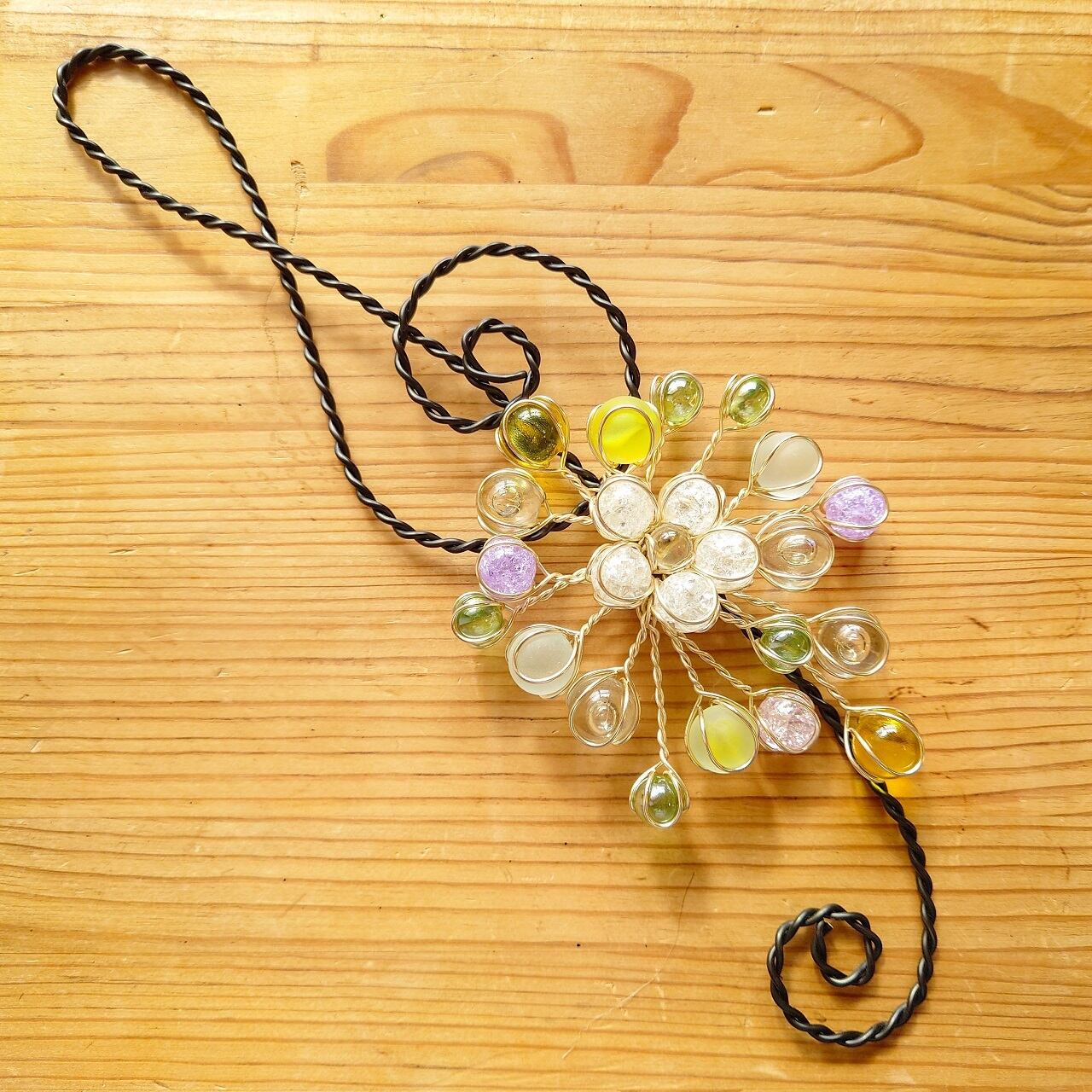 光にあたると、ガラスのビー玉がキラキラ輝いて美しい作品です。